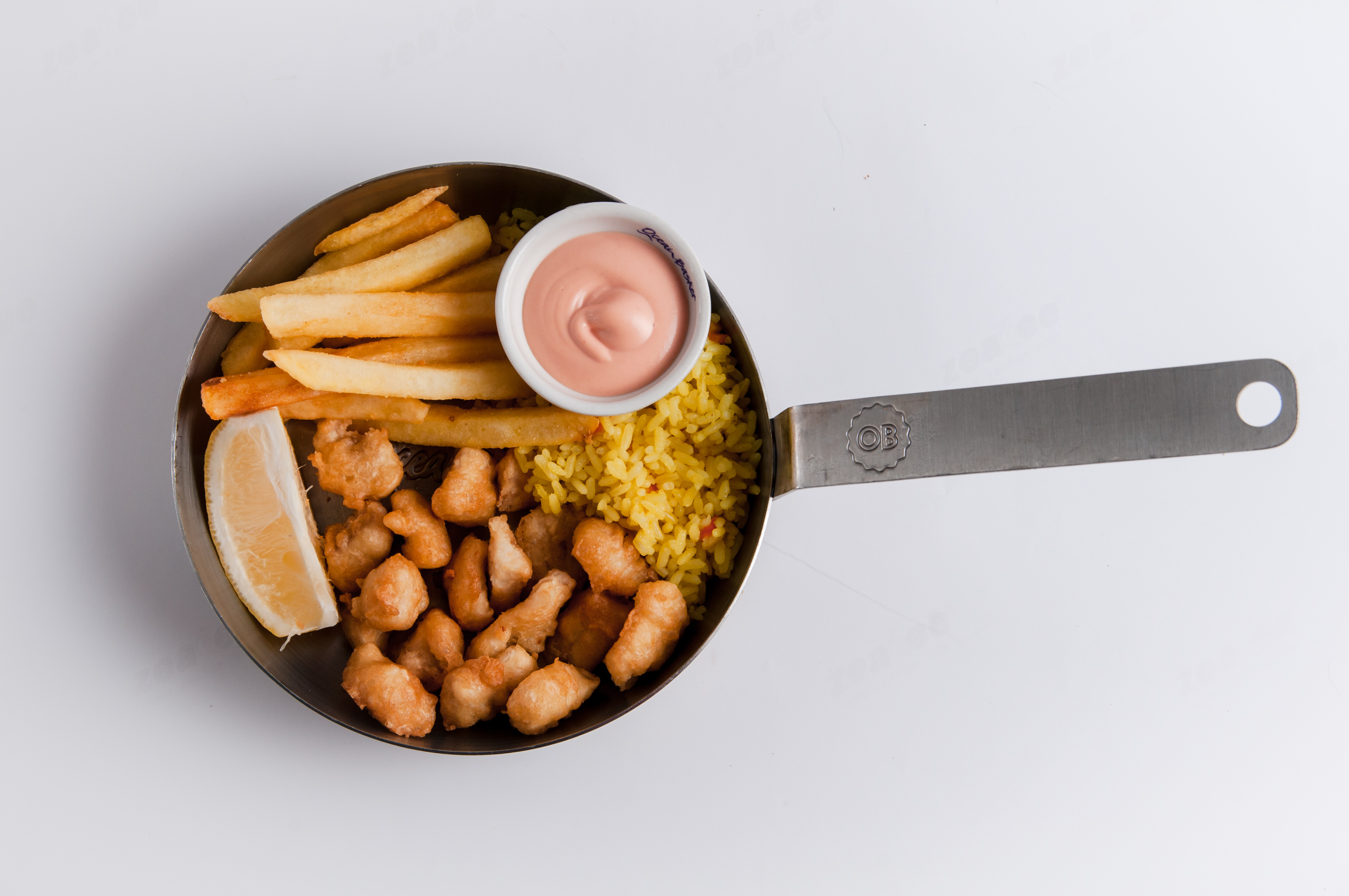 Кусочки филе хека в кляре, подаются с соусом 1000 островов, картофелем фри и рисом