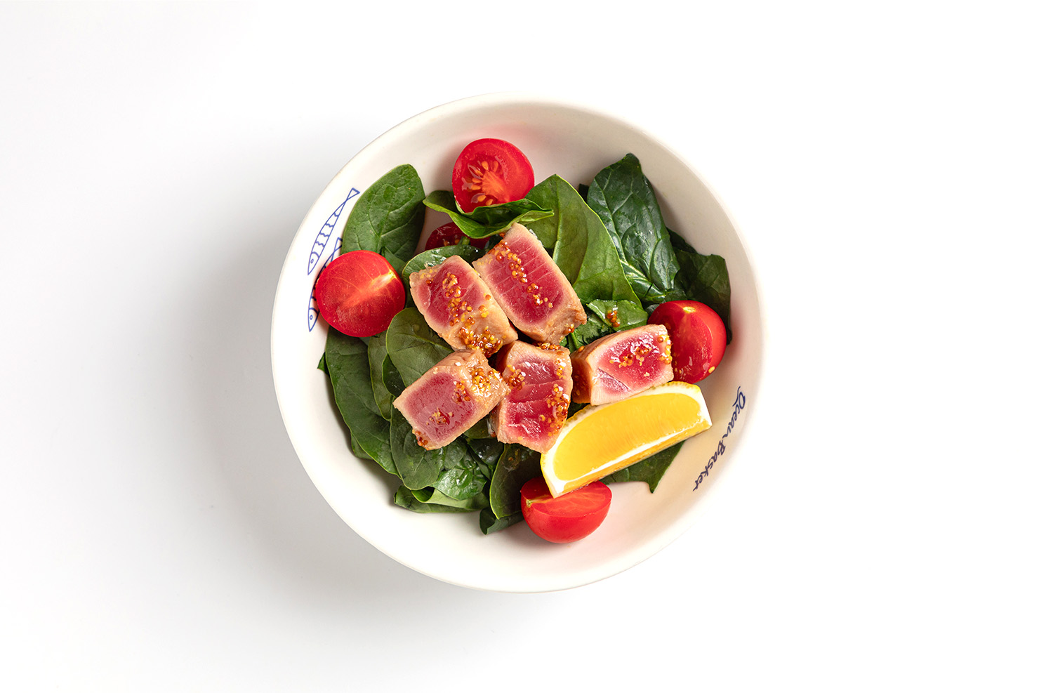 Обжаренный на гриле тунец, томаты черри, авокадо, листья шпината