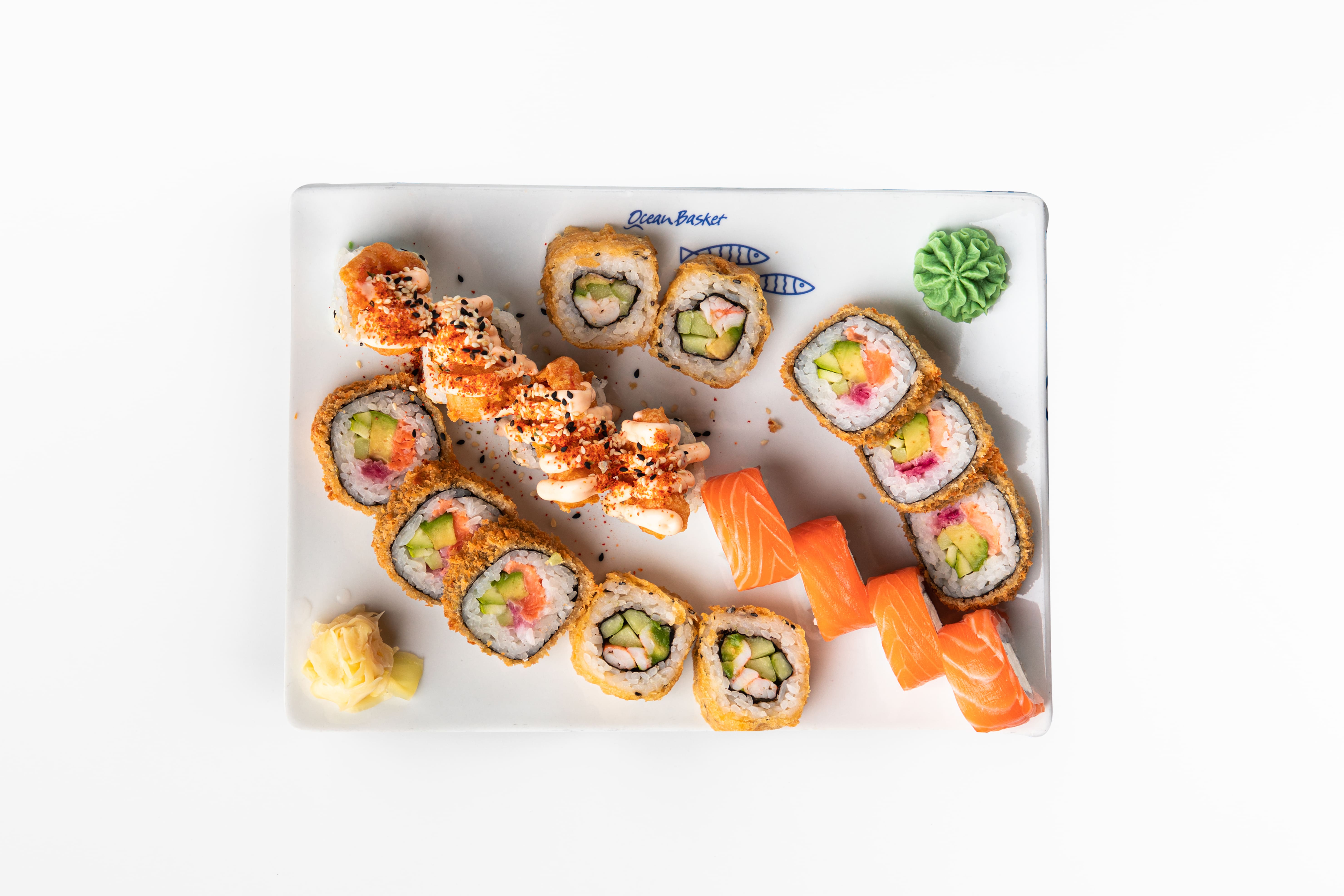 4 роллы Филадельфия, 4 темпура рок шримп, 4 калифорния роллы с жареной креветкой, 6 панко салмон футомаки