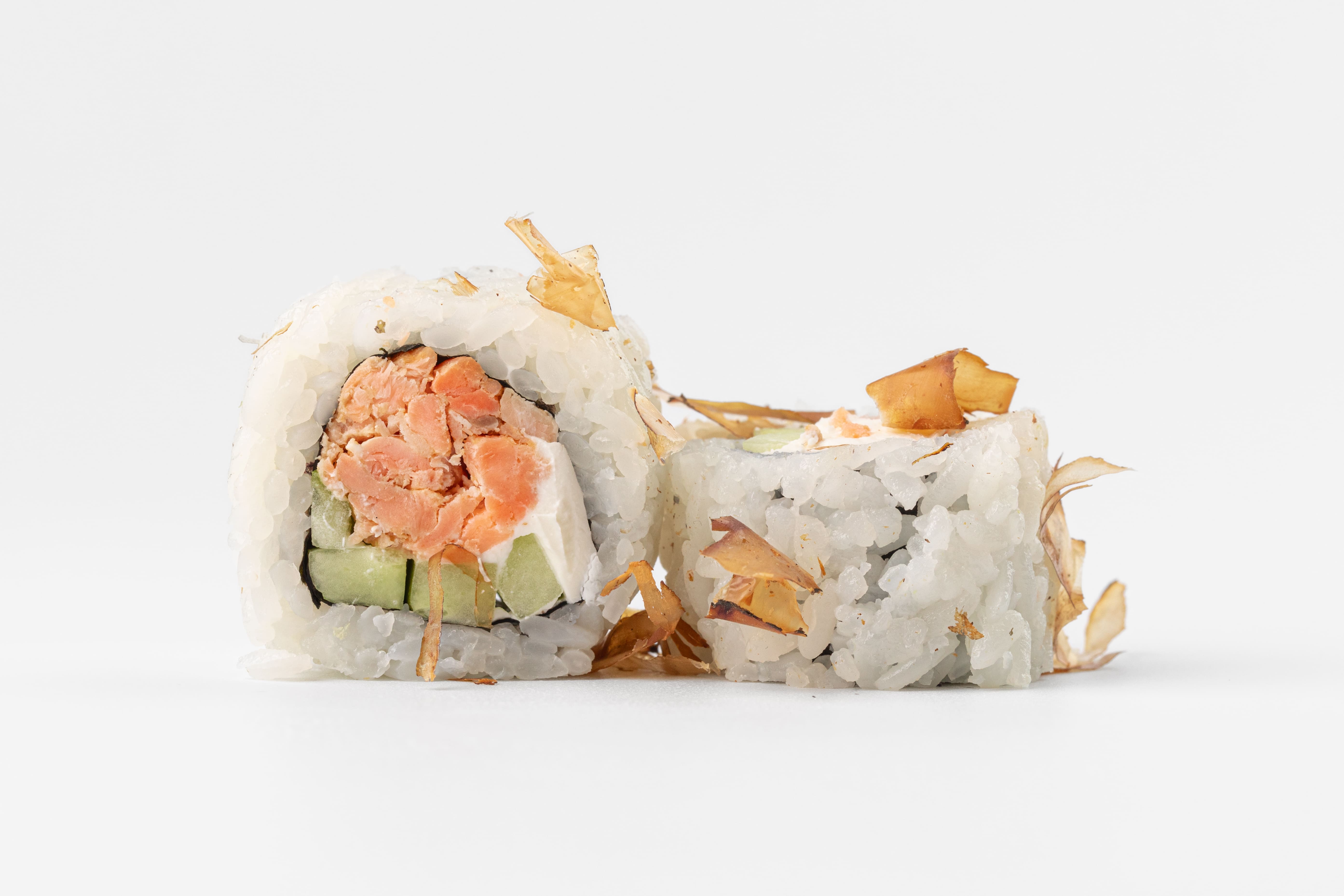 Ролл с начинкой из огурца, жареного лосося в соусе терияки и крем-сыра. Посыпается хрустящей стружкой тунца (4 или 8 шт.)