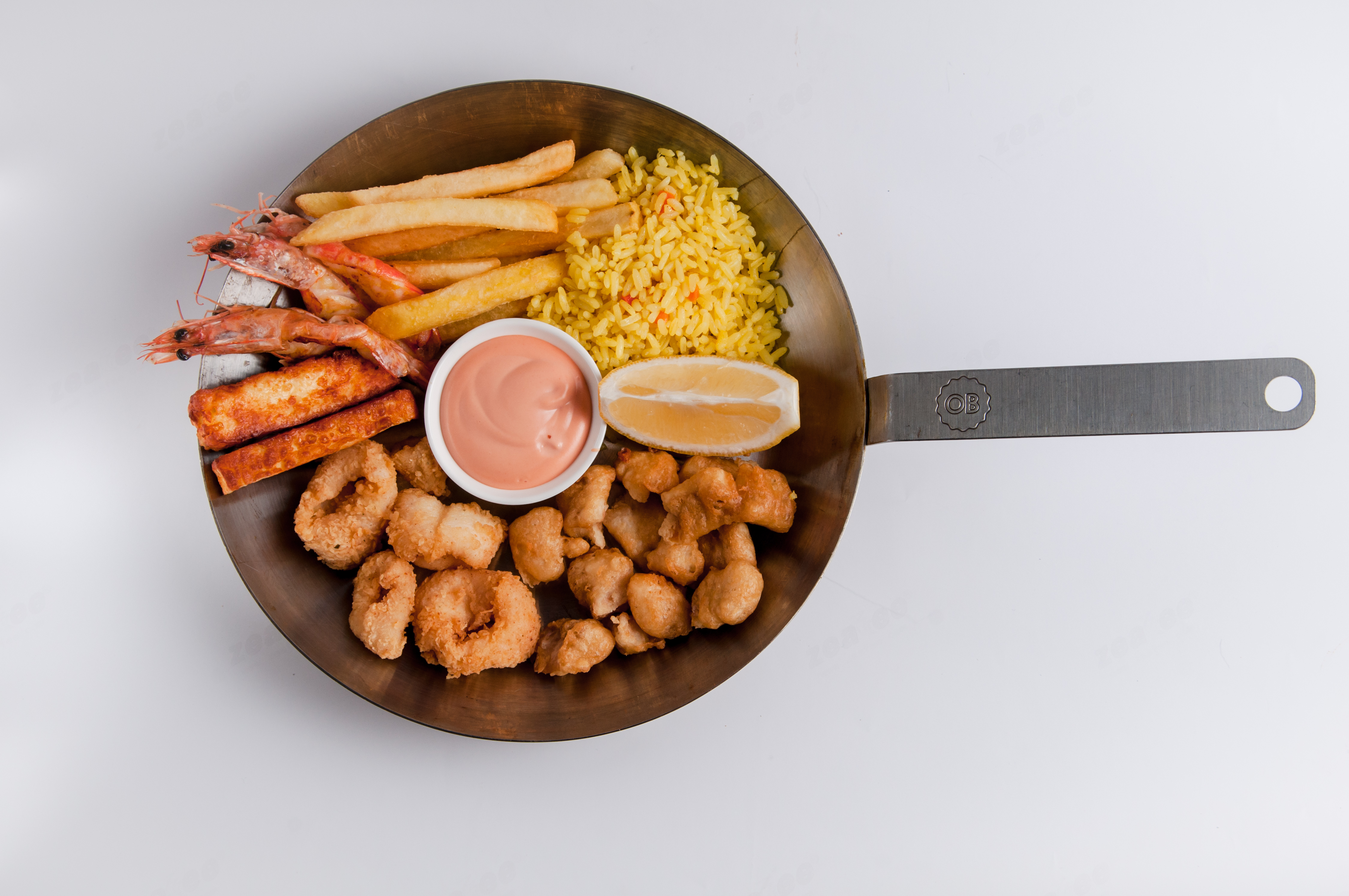 Филе хека в кляре, хрустящие кальмары, сыр халуми и 2 креветки, приготовленные на гриле, подаются с соусом 1000 островов, картофелем фри и рисом