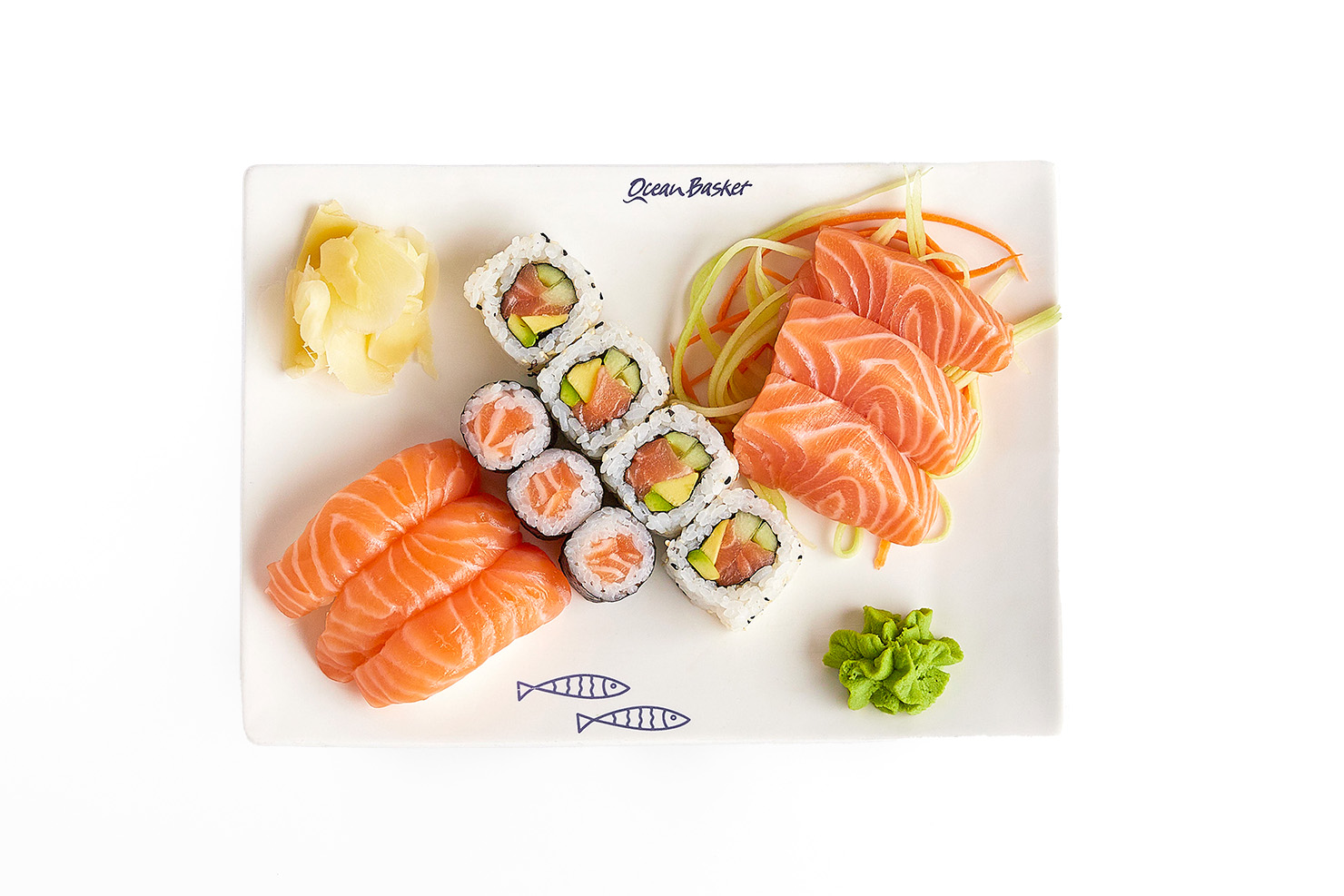 4 калифорния роллы с лососем, 3 маки с лососем, 3 нигири с лососем, 6 сашими из лосося