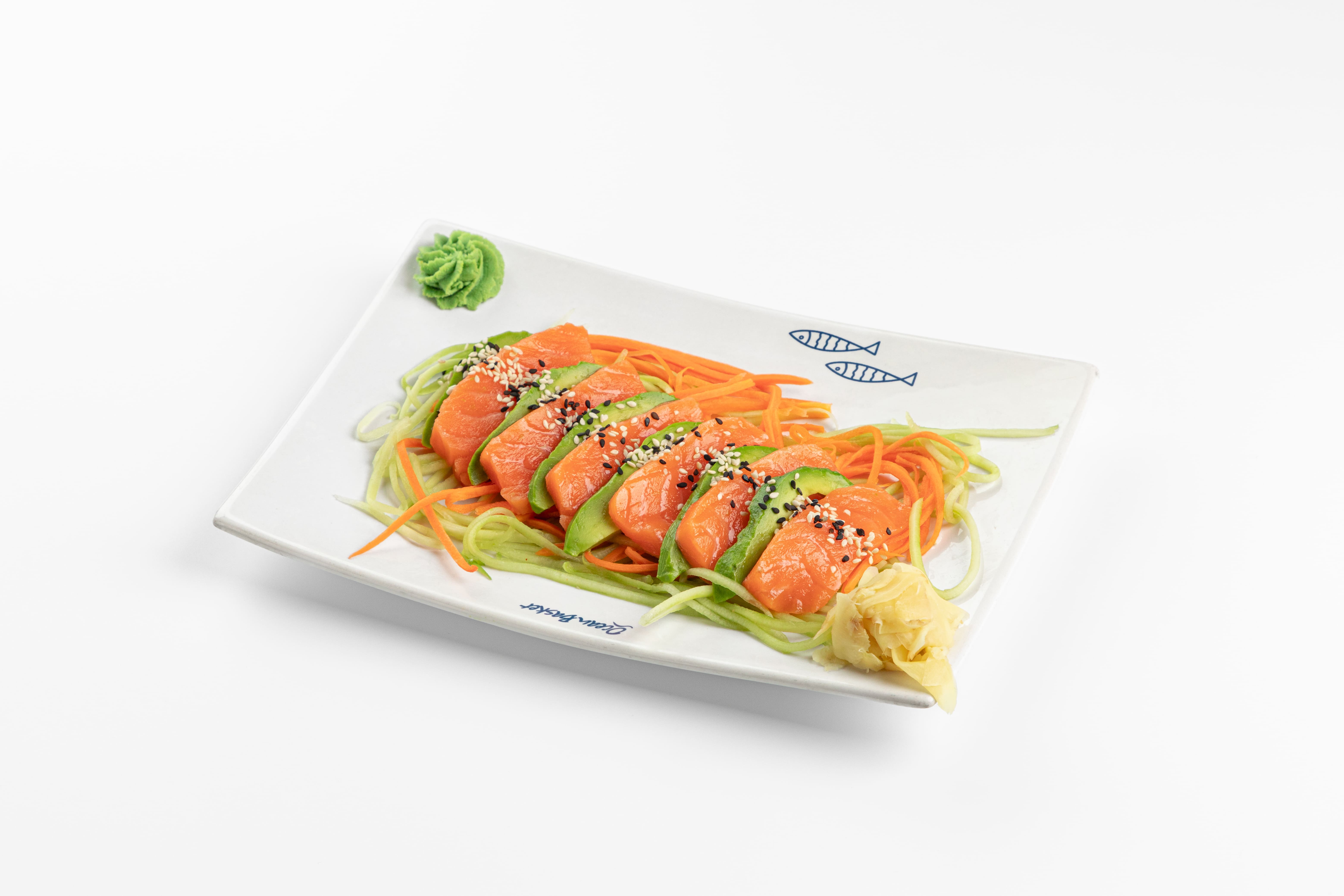 Опалённые кусочки охлажденного лосося с авокадо и подушкой из огурца и моркови. Подается с пикантным соусом Ponzu. Вес и вид блюда может меняться в зависимости от способа приготовления и других условий.