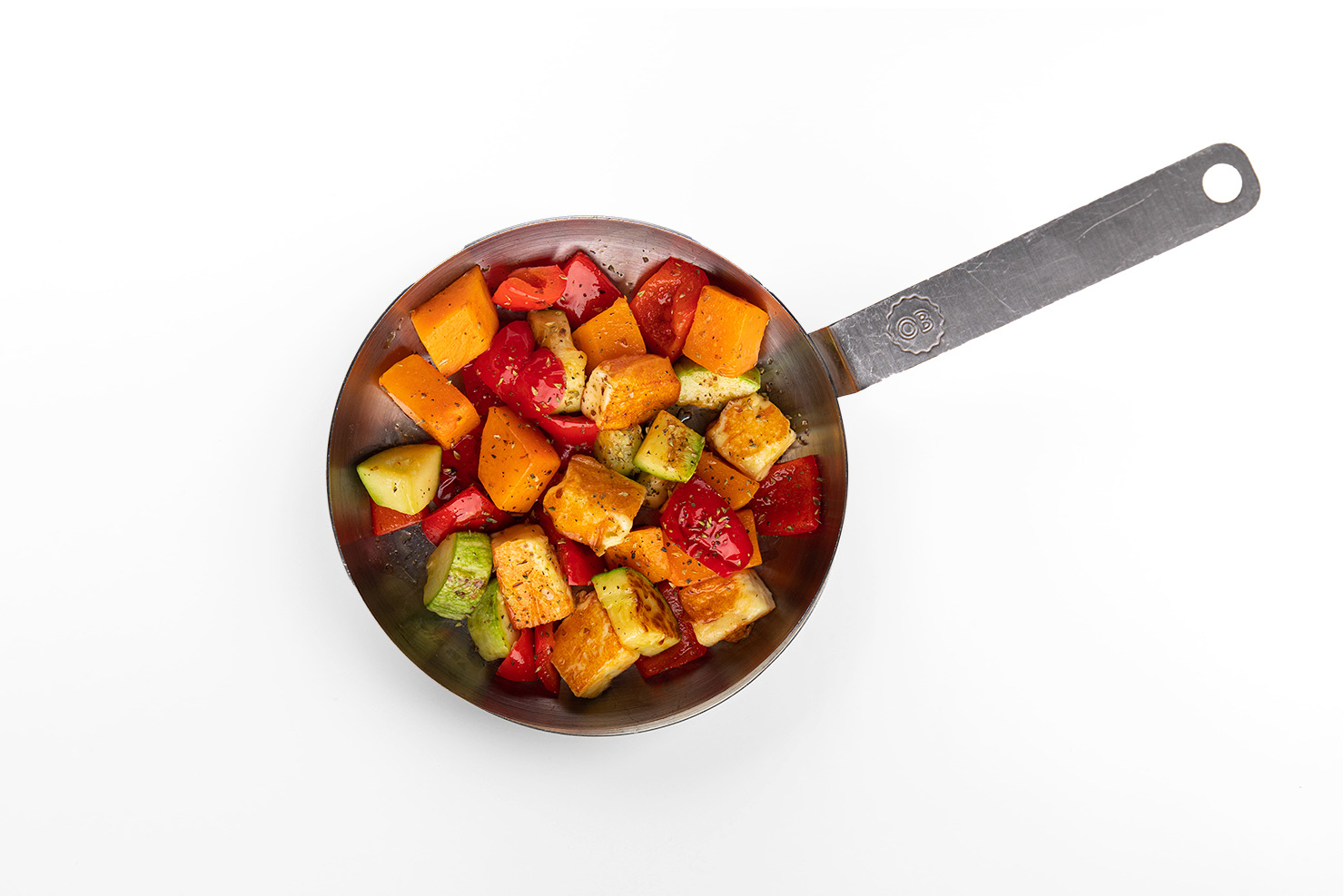 Салат из микса овощей: цукини, тыквы, болгарского перца и сыра халуми, обжаренных на гриле. Посыпается орегано. Вес и вид блюда может меняться в зависимости от способа приготовления и других условий.